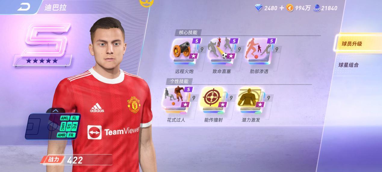 教练可以选择将迪巴拉放在边锋或者影锋的位置,这样可以最大限度的发挥迪巴拉的核心技能之一——远程火炮。迪巴拉在大禁区外带球或者接地面传球,就会触发远程火炮,该技能的效果是百分比全属计算射门成功率。需要注意的是必须在禁区外触球。在前期主线中,远程火炮是最有效率的技能之一,进球率很高,如果教练在前期没有获得心仪的前锋球员,那迪巴拉是最好的选择,通关主线章节还可以升星,提高迪巴拉的属。