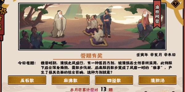 无悔华夏渔樵问答活动每天都会更新一道历史题,今天11.14的问题是:魏晋时期,清谈之凤盛行,有一种医药方剂,被清谈名士何晏所滥用,此物服下后会浑身燥热,需散步化解,后来服药散步竟成了凤靡一时的“雅事”,产生了极其负面的社会影响,这种方剂就是?这道题难倒了很多的玩家,那么小编下面就来分享下正确答案。