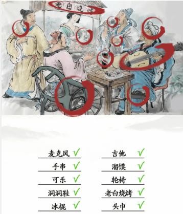 1、诗人撸串-找出10个不和谐分别有:轮椅、冰棍、头巾、吉他、洞洞鞋、溜馍、老白烧烤、麦克风、手串、可乐