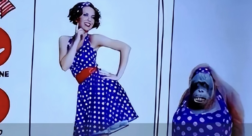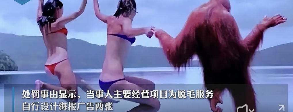 其中广告一“全球脱毛专家”的内容是两位身着泳衣的女士和一只毛发旺盛的猩猩手拉手跳进湖泊里的背影图片;广告二“全年无忧脱毛体验”的内容为:门内是身着连衣裙和高跟鞋女性,门外站一只身着相同服饰的全身毛发的猩猩。
